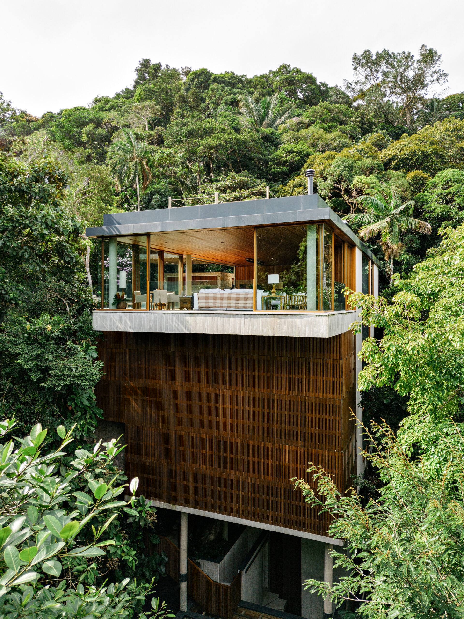 콘크리트 구조가 주된 슬랩과 지붕면을 형성해 이 집에 명확한 기하학적 윤곽을 부여한다. 이 프레임 안에서 넓은 유리 패널과 슬랫형 목재 스크린이 거실 공간을 정의한다. 목재는 중간층을 통과하는 투과성 층으로 둘러싸 빛과 공기를 걸러 주며, 화강암 바닥은 실내 공간에서 풀 데크로 이어져 집을 땅과 연결한다.
