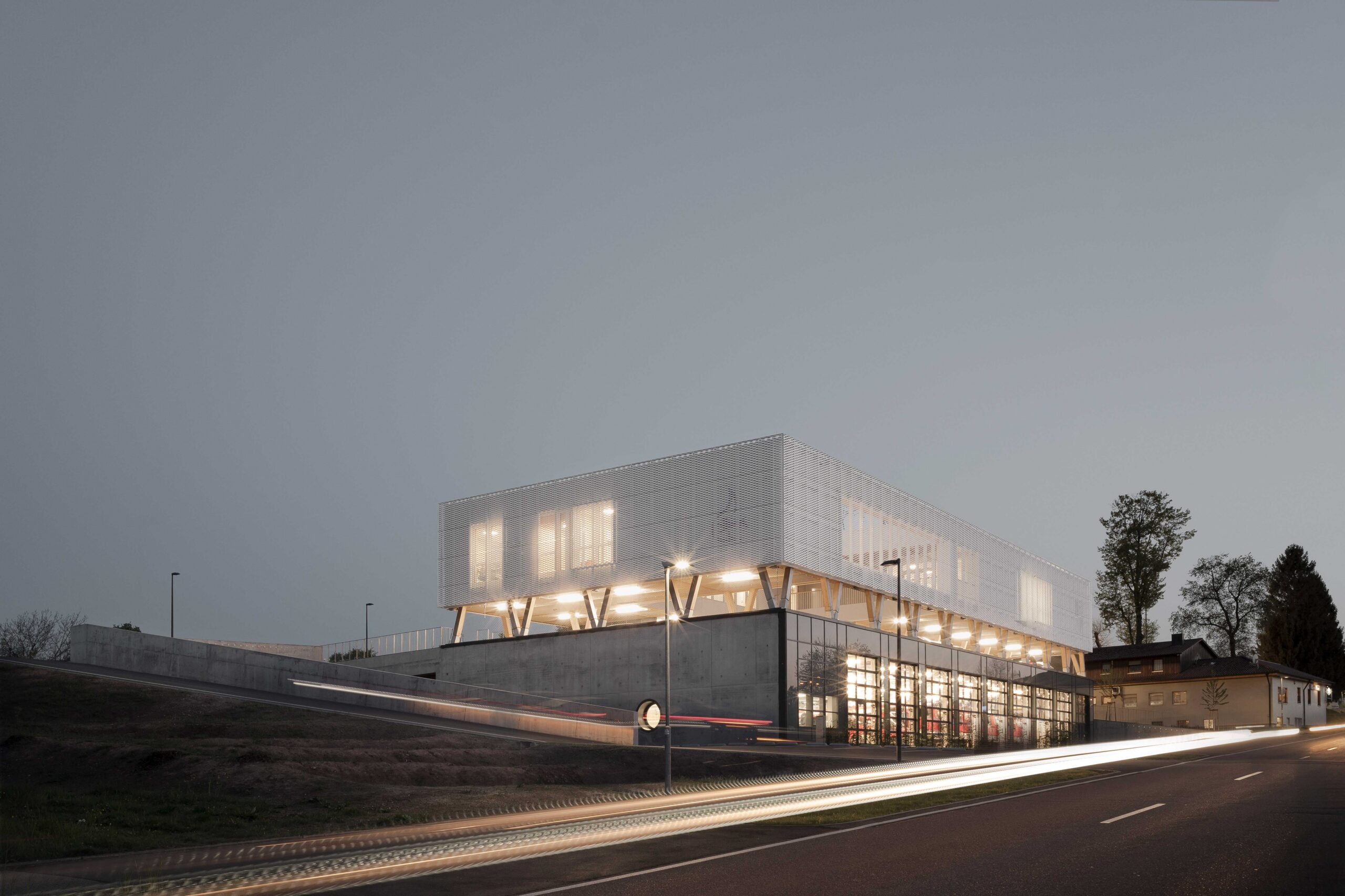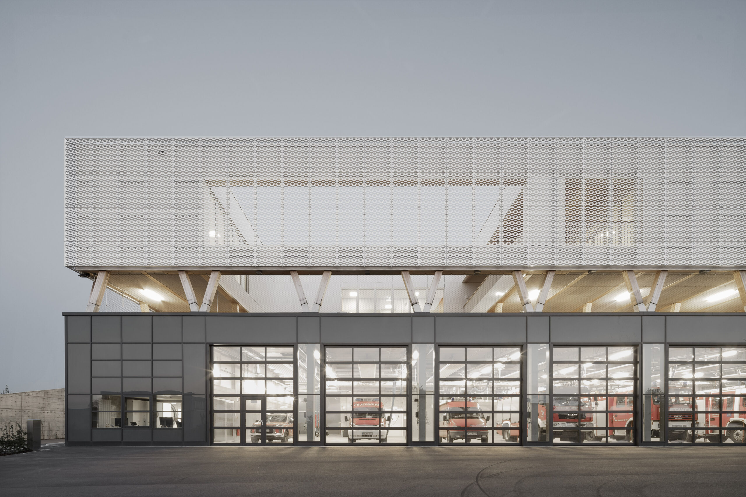 콘크리트 기초는 경사면으로 잘라져 차량 창고, 저장 공간 및 모든 필수 운영 시설을 담고 있으며, 북측 입구는 거리로 직접 열려 신속한 배치를 가능하게 한다. 그 위에는 개방형 데크가 주차 및 이벤트 공간으로 기능한다. 최상부는 목재로 지어졌고 연속적인 흰색 확장형 금속 파사드로 감싸져 교실과 사무실을 수용한다.