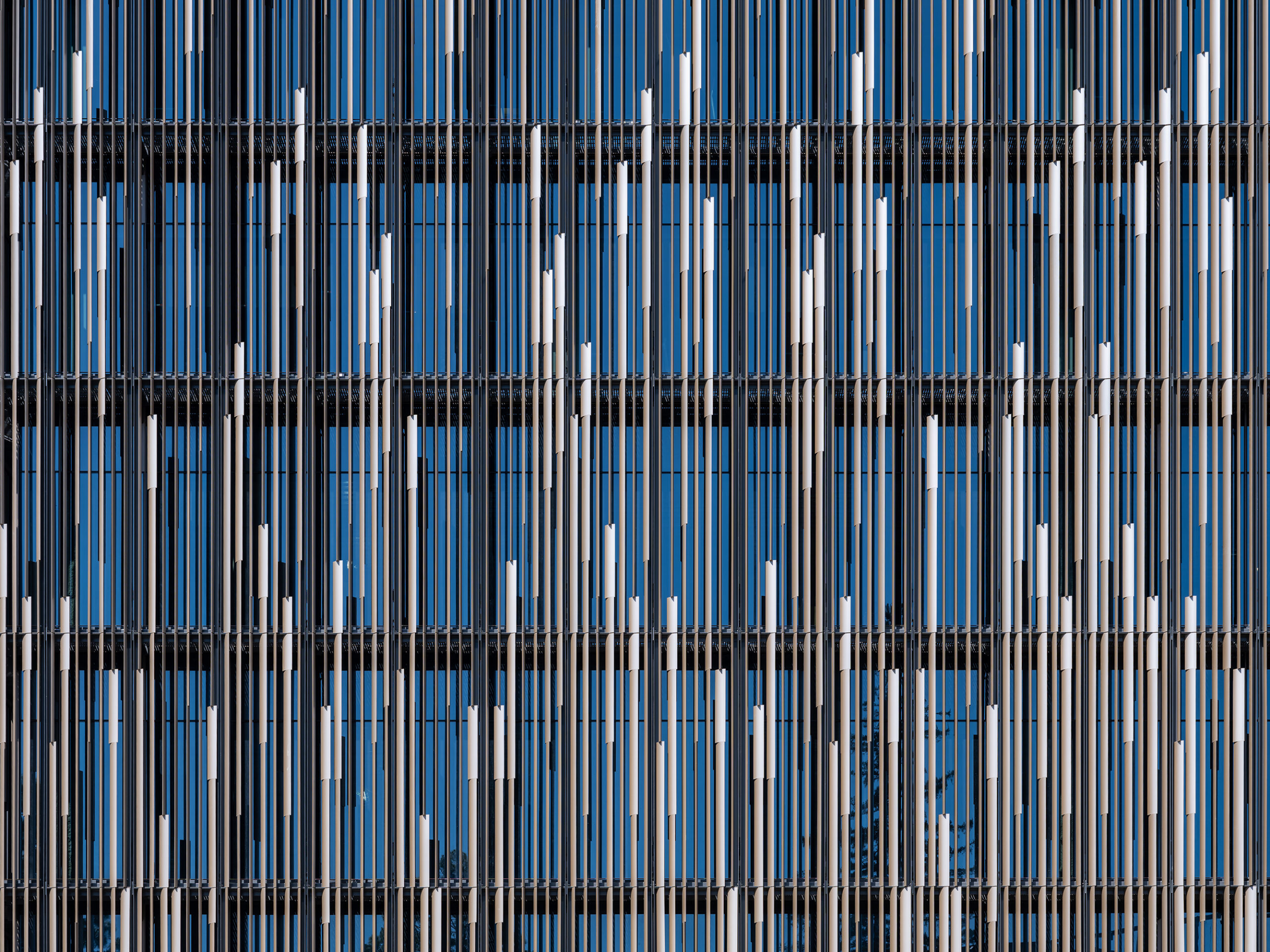 접근하면 이 읽기가 바뀐다. 겉으로는 단단해 보이는 볼륨은 사실 연속적으로 배치된 세로 알루미늄 루버의 층으로 뒤싸여 있어, 커튼월 앞에 위치한다. 처음에는 불투명해 보이는 것이 점차 깊이와 간격을 드러낸다. 이 루버 핀은 태양 차단 표적을 정확히 맞추도록 각도가 맞춰져 있어, 파사드를 투명한 유리 코너와 대조되는 연출적 스크린으로 바꾼다.