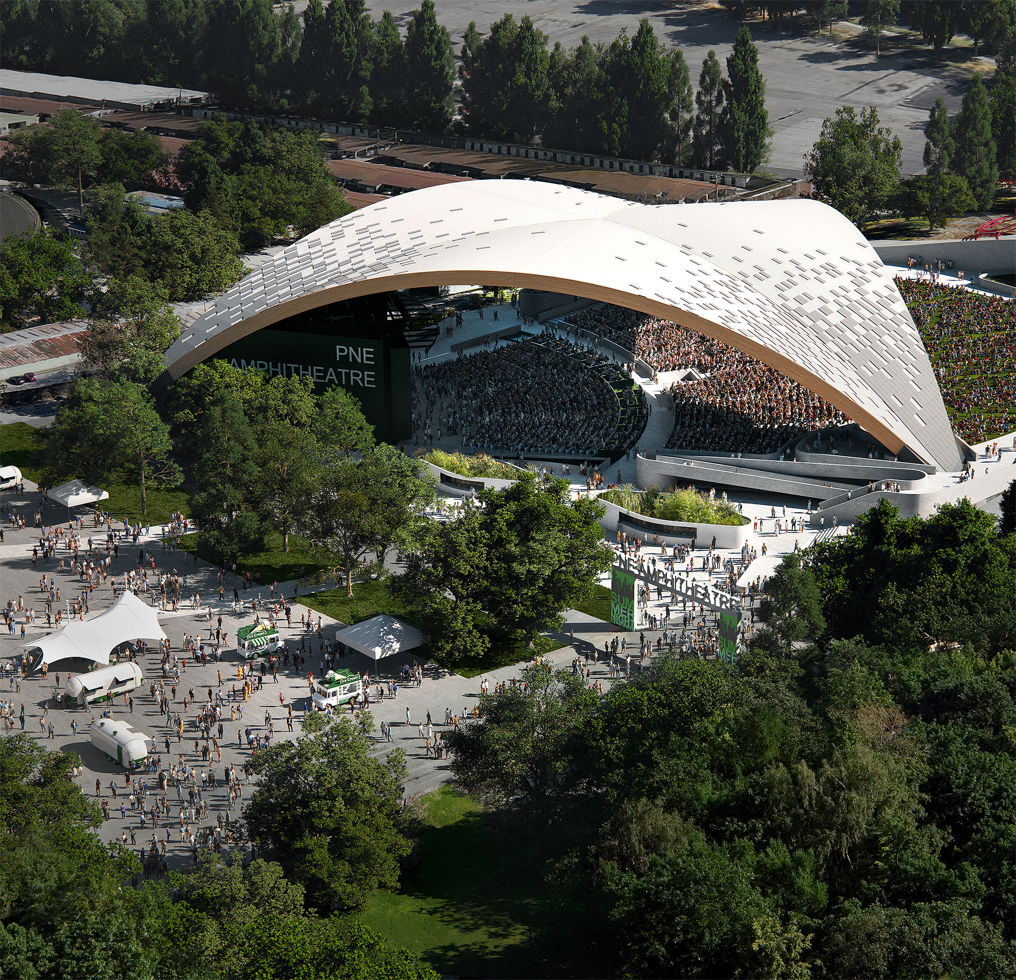 더 큰 규모로 보면, 현재 밴쿠버에서 PNE Amphitheatre를 추진 중이며 올해 내 완공될 예정이다. Revery Architecture가 이를 “최고급 야외 공연장으로 최대 10,000명의 관객 수용”으로 표기했고, 여전히 다중 용도와 광범위한 프로그램 운영에 초점을 맞추고 있다. 분명히 아름다운 설계도 주변 지형을 고려하면 더욱 인상적이다. 345피트(105미터) 규모의 매스 목재 지붕은 Windermere Hill의 곡선을 따르며, 관객들에게 멀리 보이는 North Shore Mountains의 풍경을 감상할 수 있는 멋진 시야를 선사한다.