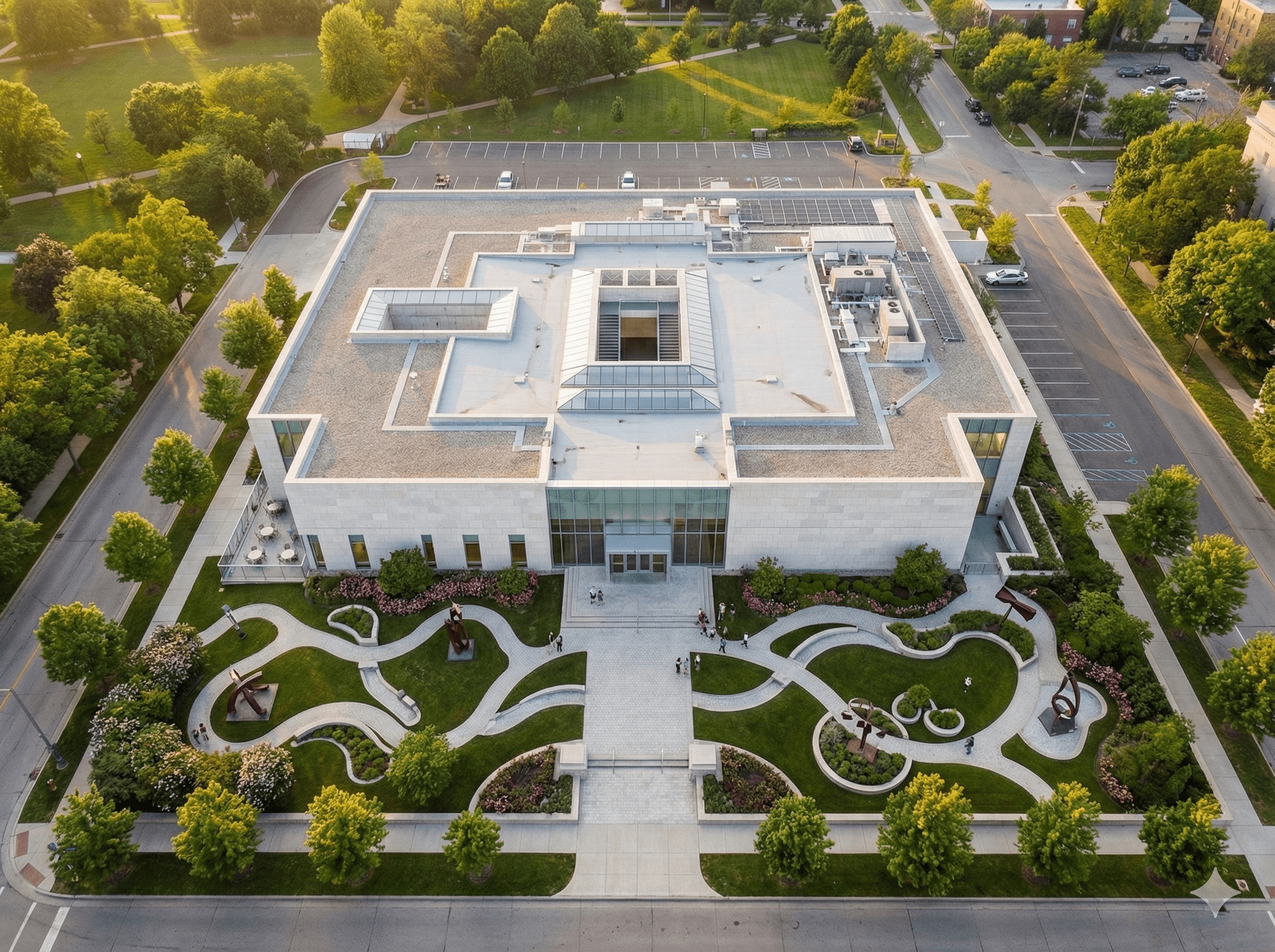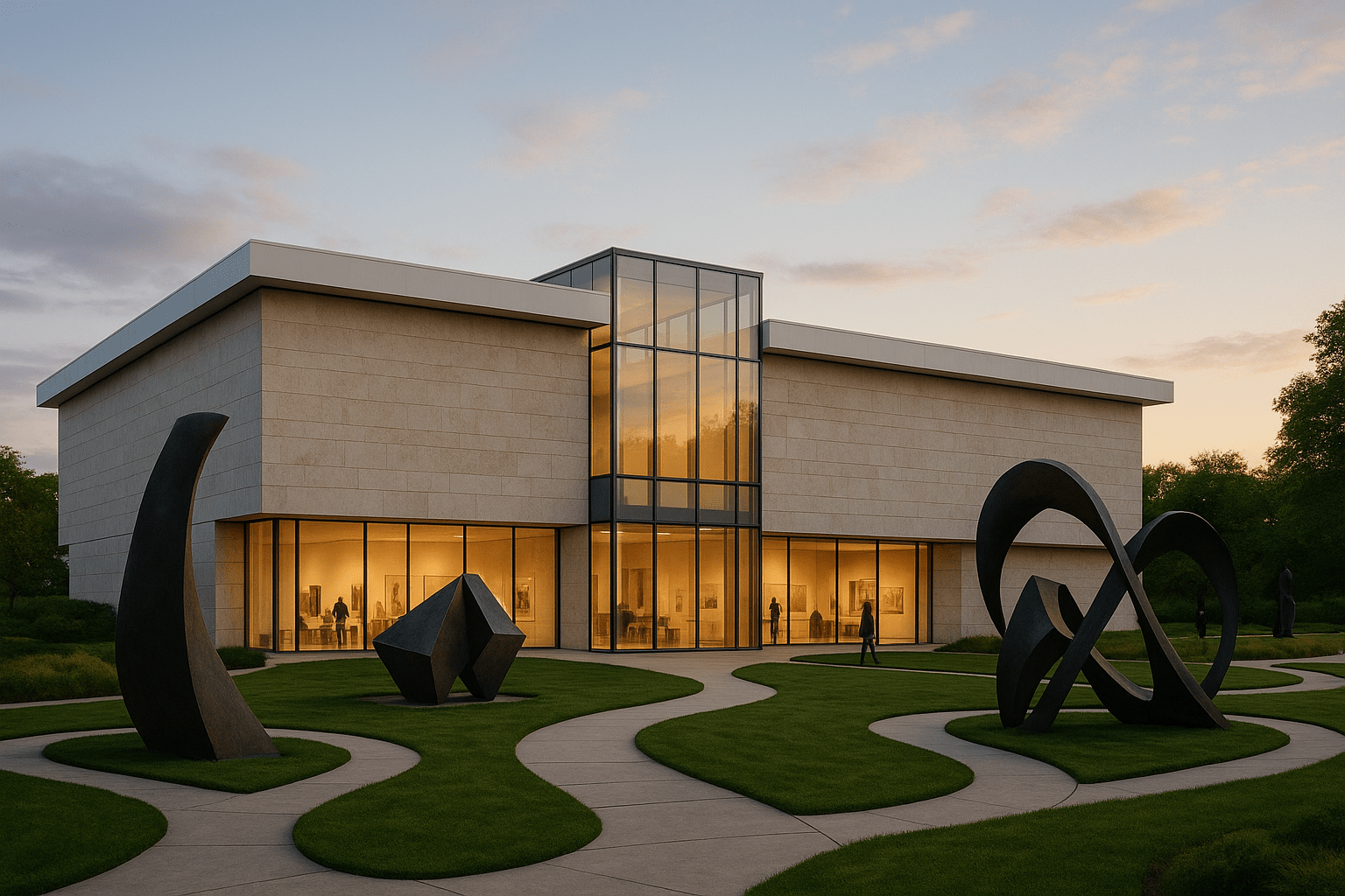 환경: 구불구불한 산책로가 있는 정원과 추상적 금속 조각들.