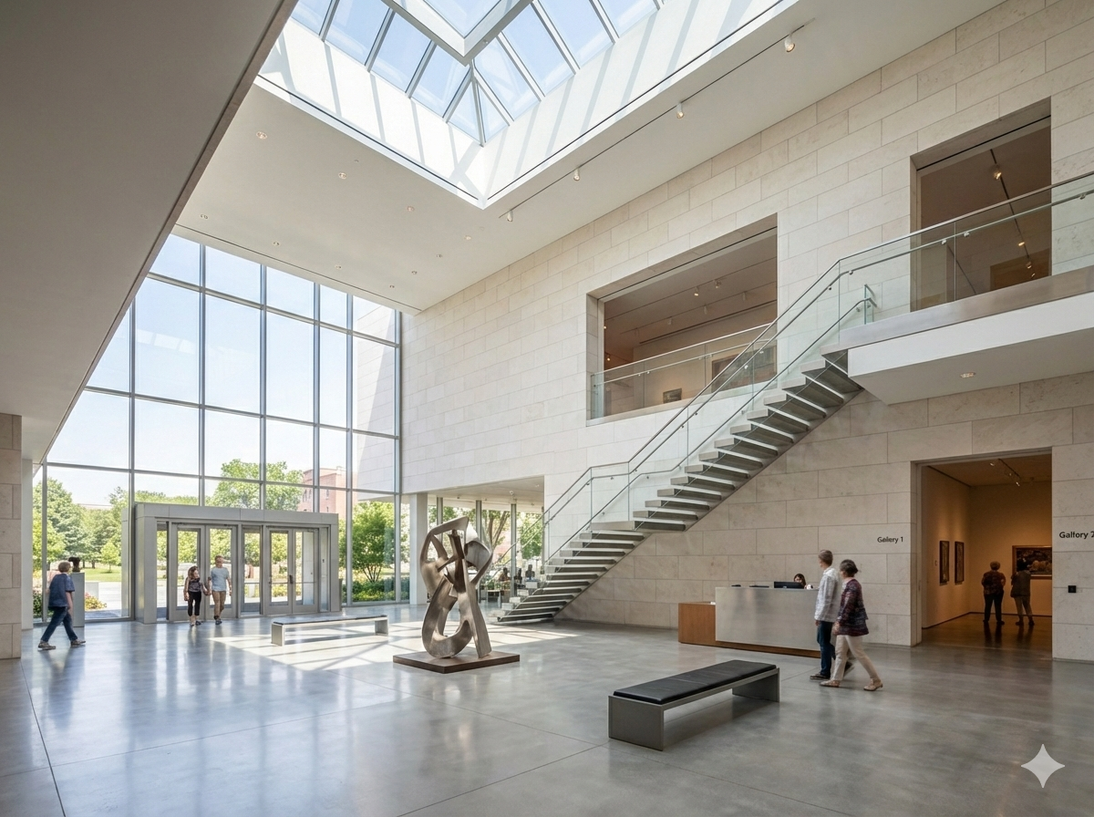 주제: 평평한 흰색 지붕과 석회석 클래딩을 가진 현대적 2층 미술관.