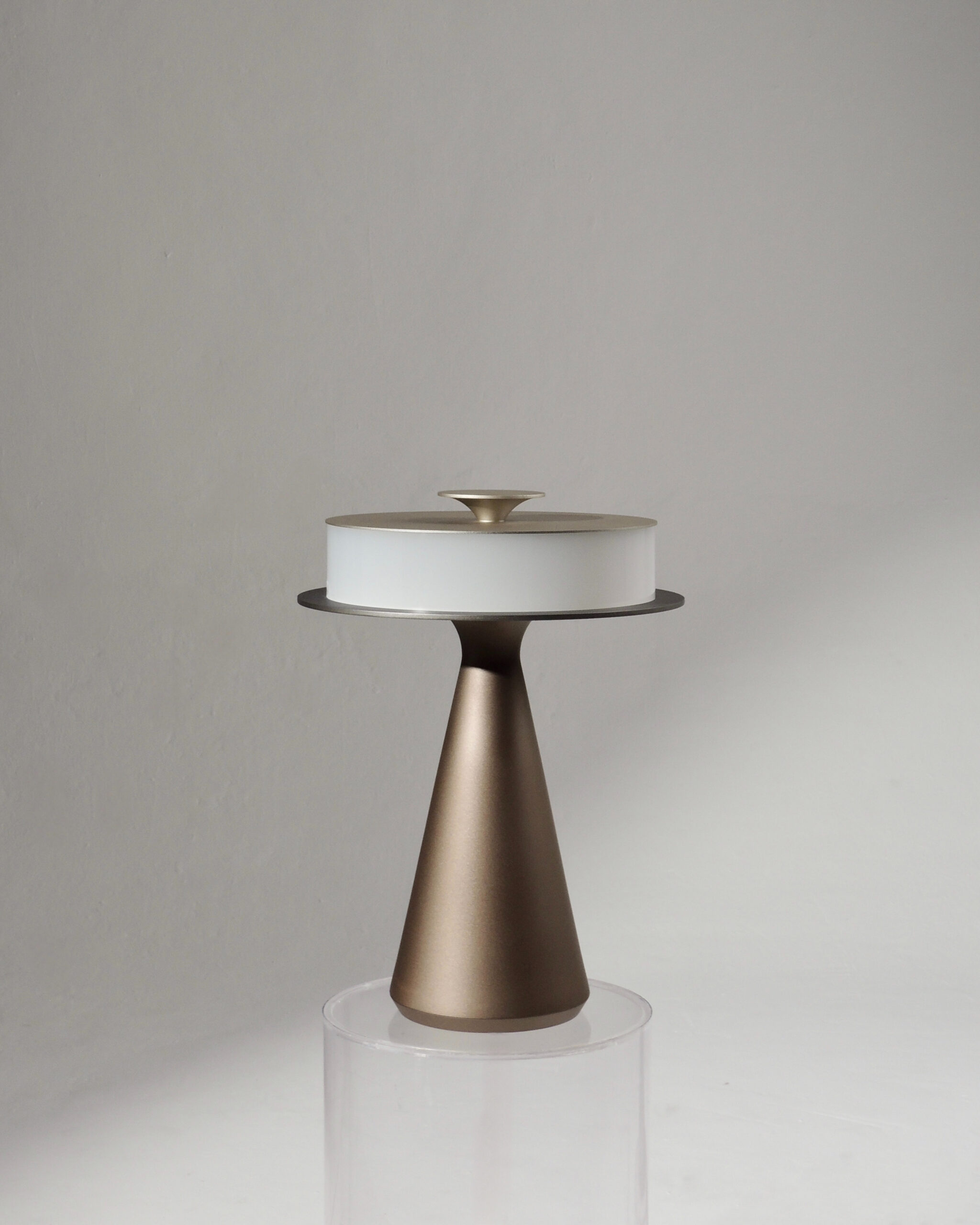 Take Me는 두 부분으로 구성된다: 디스크와 받침대. 형태는 안정적이지만 방 안에서의 역할은 다소 모호하다. 빛은 오팔린 글라스를 통해 확산되며, 차광의 깊이와 재료 마감으로 더욱 부드럽다. 색온도와 밝기는 디스크 자체를 회전시켜 제어할 수 있다. 앱이나 인터페이스, 리모컨 없이도 촉각적으로 직관적으로 작동한다. 본체는 브러시드 메탈에서 따뜻한 색조의 목재에 이르는 맞춤 색상과 재료 팔레트로 제공되어, 격식 있는 공간과 비격식 공간 모두에 adaptable하다. 작은 램프지만 어디에 두더라도 시각적으로 존재감을 느끼게 한다.