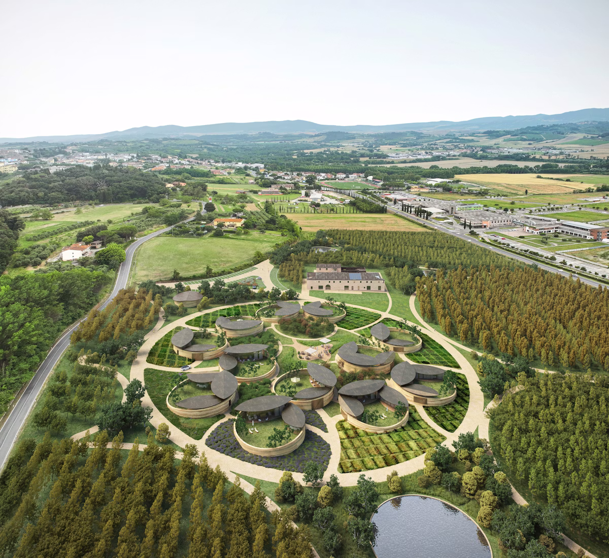 핵심적으로 이 프로젝트는 픽셀 파밍에 기반한 마이크로팜 모델을 제안합니다. 소규모이고 다양한 농지 구역을 통해 생태학적 균형을 유지하며 산출량을 높이는 것을 목표로 합니다. 이 농업 풍경은 12채의 흙집 사회주택으로 보완되며, 현대적이고 저탄소 재료인 산화 아연, 3D 프린팅, 목재를 사용해 전통적인 토스카나식 피실 농가를 재해석합니다.