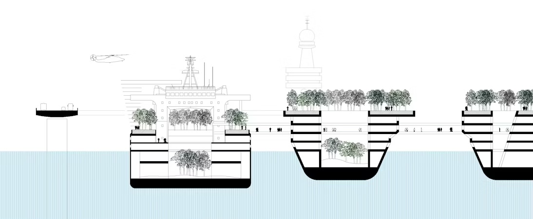 항공모함에 런웨이가 들어선 공원을, 유조선의 오래된 저장 구역을 공용 공간이나 떠다니는 오랑제리로 재해석하는 등의 대담한 아이디어가 이 항목의 중심이다. 전쟁과 생태 파괴에 연결된 기계로부터 벗어나 새로운 생명—또 삶—이 자라나도록 하는 서식처로 선박을 재구성하려 한다. 군수산업 복합체와 해상 물류가 환경에 남긴 막대한 영향을 고려하면, 이 프로젝트는 글로벌 주택 위기의 시대에 그다지 비현실적이지 않으며, 오히려 완전히 논리적일 뿐이다.