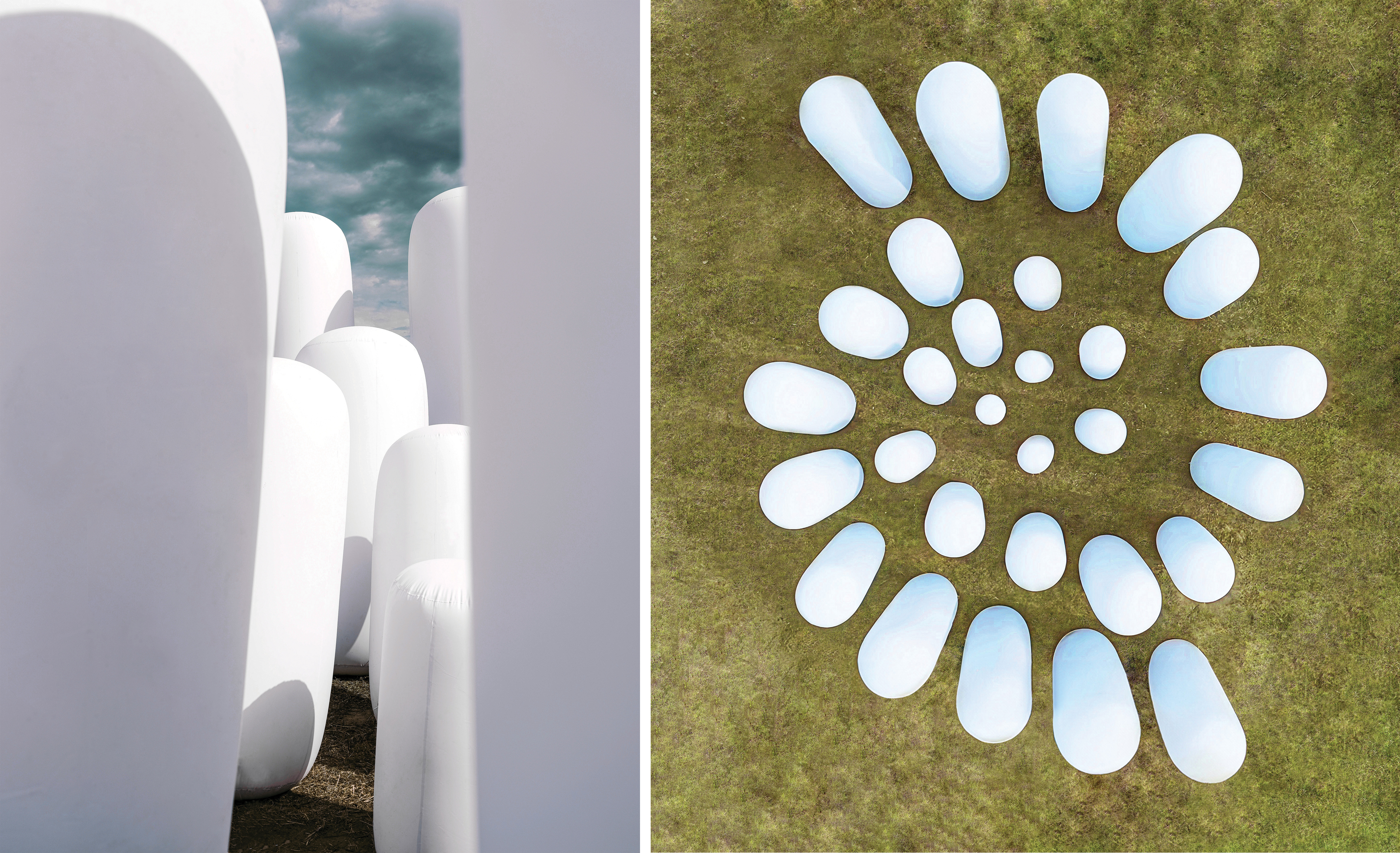 Una vez que nos decidimos por las inflables, empezamos a explorar cómo usarlas, qué formas podrían tomar y qué significados podrían llevar. El sitio —un parque nacional de humedales— inspiró una conexión con Stonehenge, con sus piedras verticales antiguas. Nos dimos cuenta de que las columnas inflables compartían una forma similar, pero con un giro lúdico: a diferencia de las piedras reales, podían moverse, balancearse e incluso “bailar” cuando las personas las tocaban.