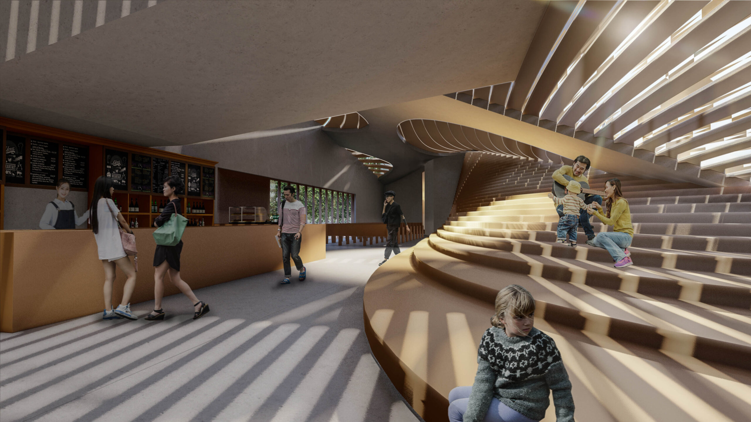 DW: En otro de nuestros proyectos que también recibió un A+Award — Voyage Chapel — desafiamos las expectativas al usar formas arquitectónicas sólidas para expresar la fluidez del agua. Se diseñó una formación de escaleras en cascada para simular el ritmo de las olas del océano y la topografía estratificada del lecho marino. Al cambiar sutilmente la textura de los materiales a lo largo de la superficie, creamos la ilusión de profundidades variables, muy parecido al propio océano. Bajo los peldaños, el espacio se siente como si estuviera bajo el agua, donde la luz se filtra para crear un efecto deslumbrante y ondulante. Sobre los peldaños, los visitantes recorren un terreno esculpido que evoca la sensación de caminar sobre las olas — un gesto poético que remite directamente al nombre del proyecto: Voyage Chapel.